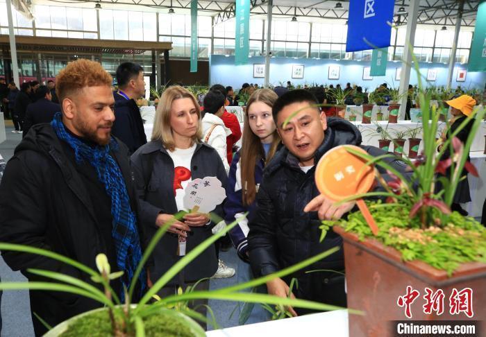 兰农(右一)向国际友人介绍春兰。钱光祥 摄